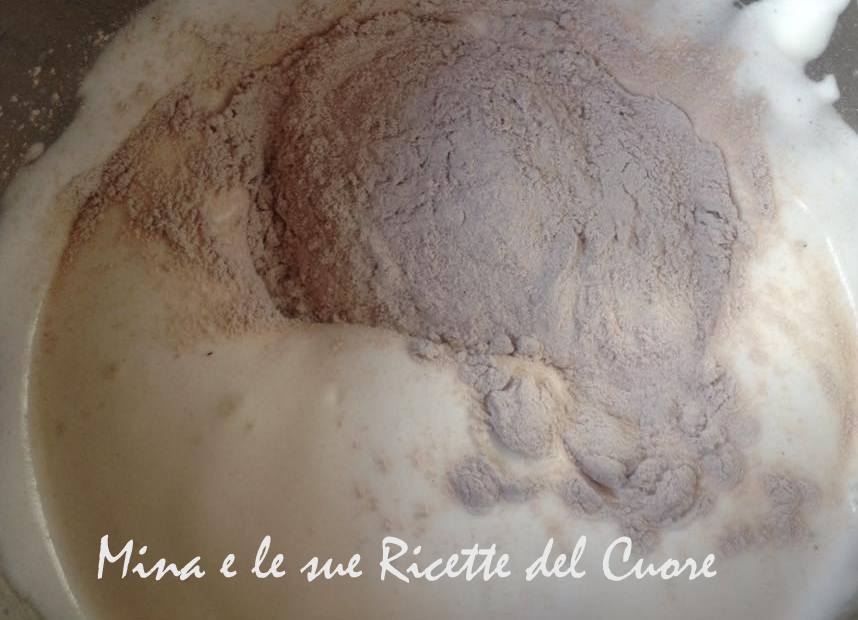 Trascorso il tempo delle lievitazione setacciare la farina con il cacao, mettere nella ciotola della planetaria (oppure in una ciotola capiente se facciamo l’impasto a mano), il Poolish, il lievito rinfrescato, 170 g di acqua e con la frusta sciogliere bene il tutto, aggiungere metà farina setacciata (250 g) amalgamare bene e lasciare riposare l’impasto per 30 minuti.