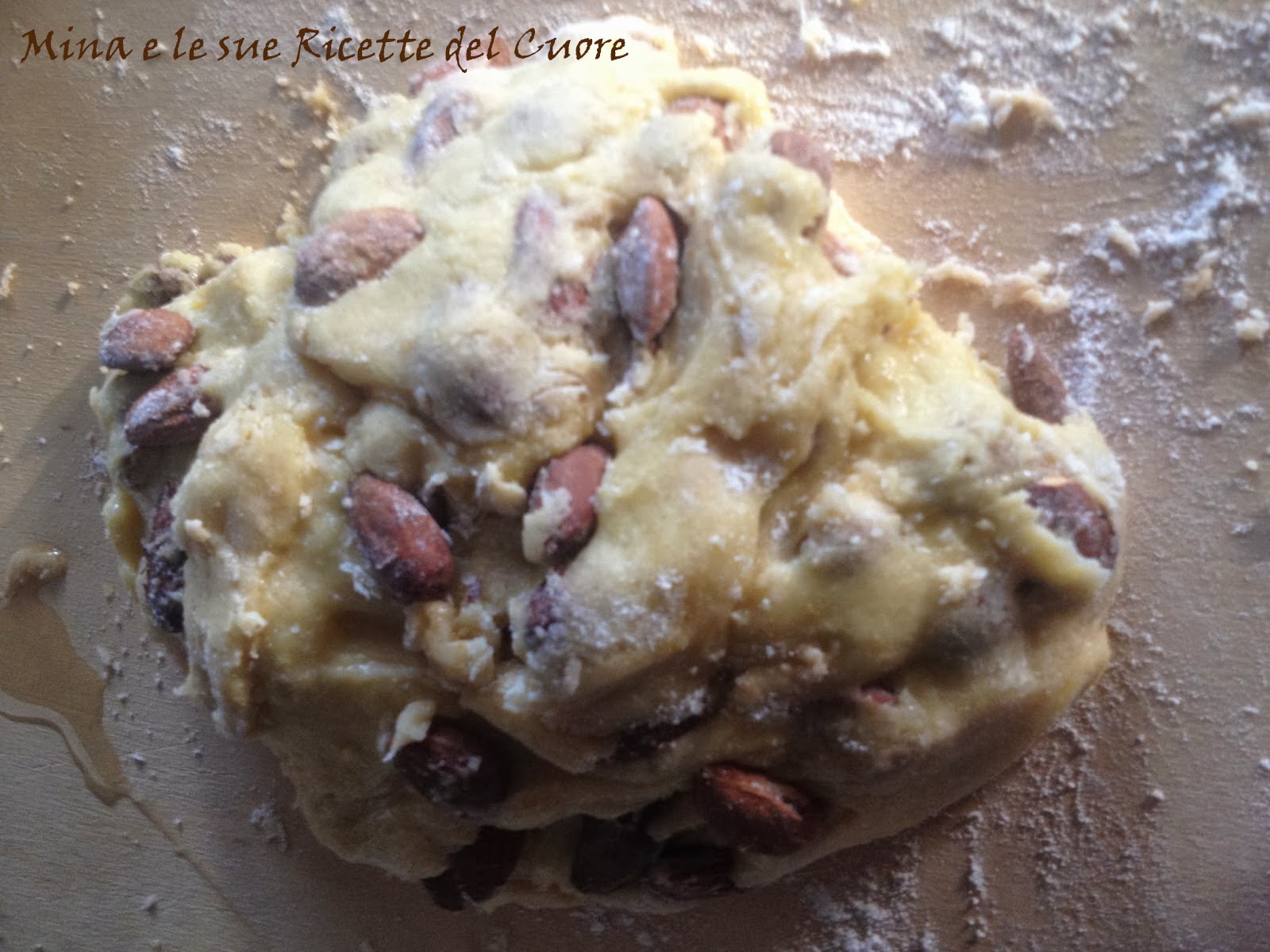 Aggiungere le mandorle ed i pinoli, impastare in modo da