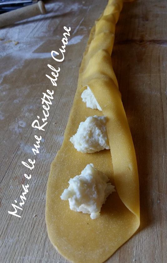 Tirare la sfoglia alla macchina della pasta in strisce abbastanza fine e non troppo larghe, tagliare dei quadrati posizionare un po’ di ripieno al centro e chiuderli tradizionalmente a fazzoletto.