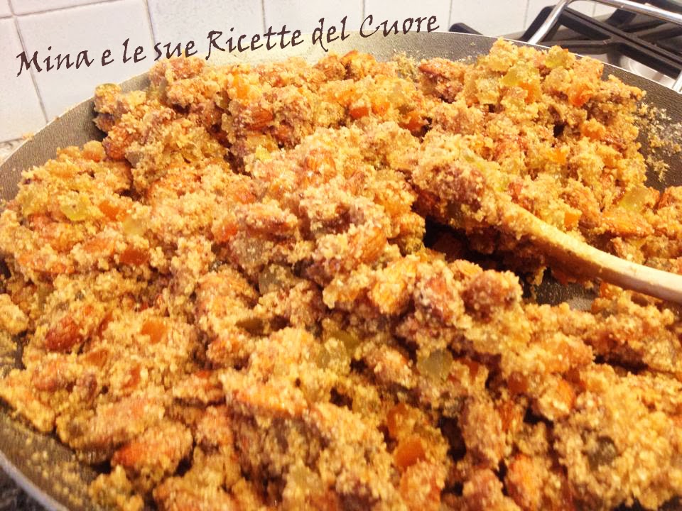 Sempre sul fuoco aggiungere la miscela di farine e spezie, rigirare molto bene in modo che le polveri si impastino con i canditi e le mandorle.