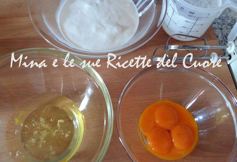 Separare le uova, mettere gli albumi in una ciotola e montarli a neve ben ferma con un pizzico di sale e trasferire in frigorifero.
